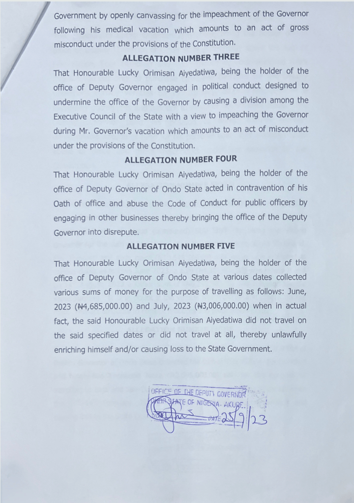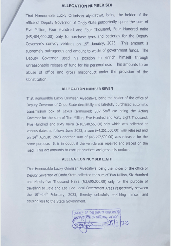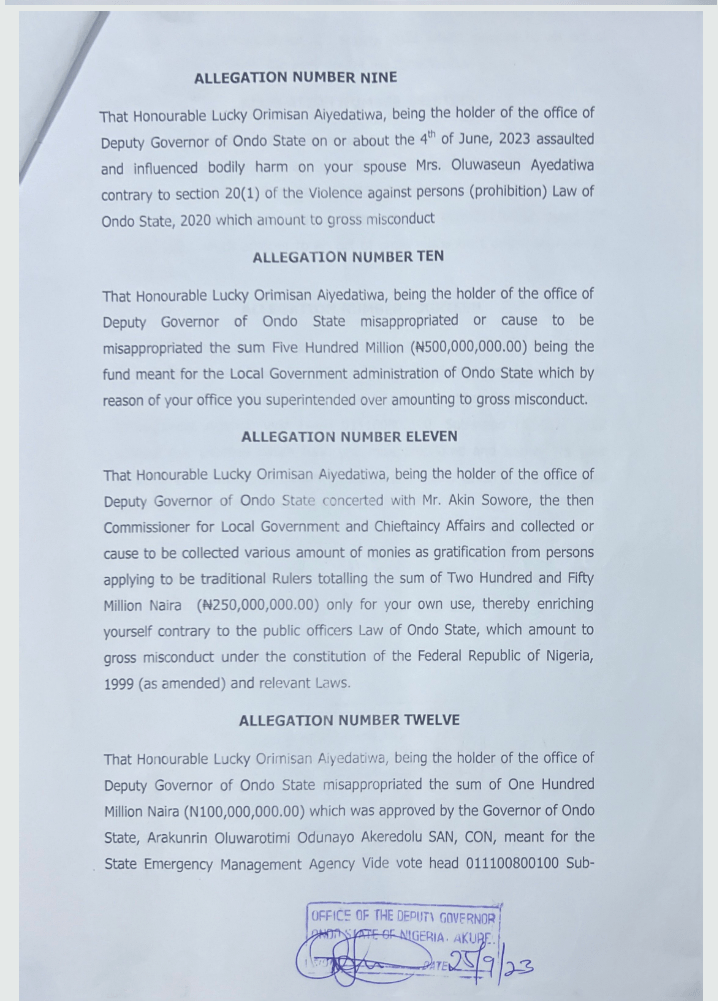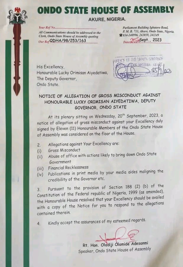 Ondo State House of Assembly has levelled 14 allegations against the embattled Deputy Governor, Mr Lucky Ayedatiwa, which he’s expected to respond to.