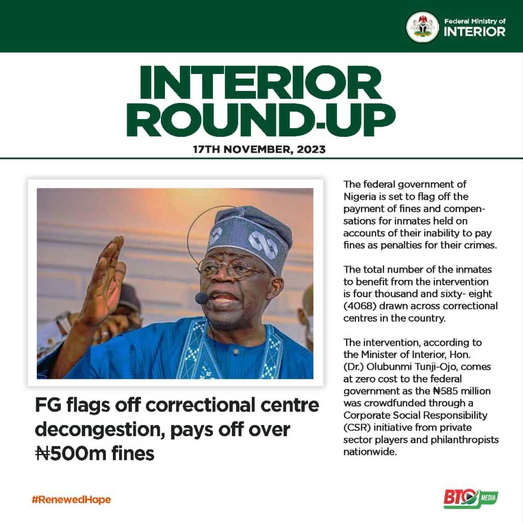 Recall that the Minister of Interior had in October revealed plans to decongest correctional facilities, saying about 4,000 inmates are in prison due to their inability to pay a total of about five hundred million naira in fines.