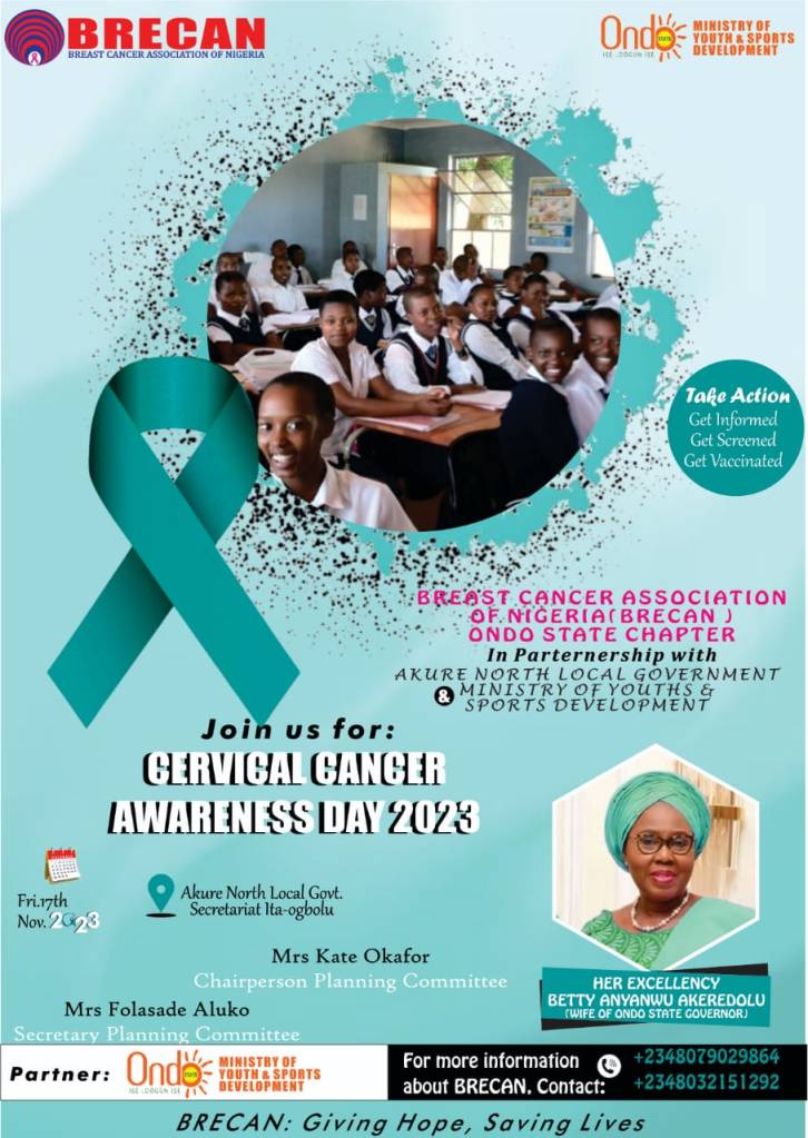The Breast Cancer Association of Nigeria, BRECAN, founded by the First Lady of Ondo State, Chief Betty Anyanwu-Akeredolu, joined the globe on friday, to mark 2023 World Health Organisation’s Global Strategy to eliminate cervical cancer.