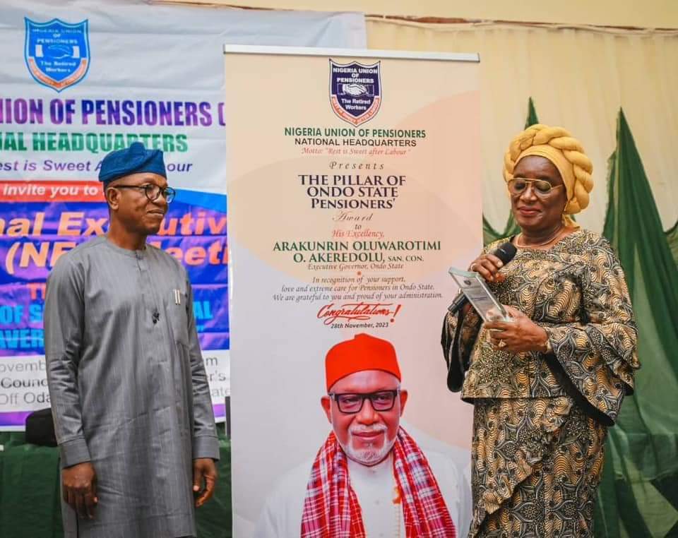 The Nigeria Union of Pensioners (NUP) has honoured the Ondo State Governor, Arakunrin Oluwarotimi Akeredolu Aketi,SAN, CON, with an Award of Excellence as the Pillar of Pensioners in the state.