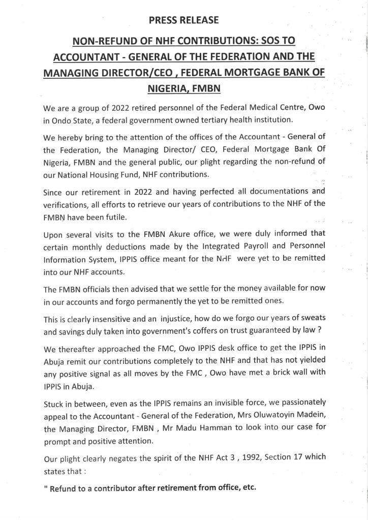 In a press release made available to newsmen in Akure , the affected retirees lamented ” Since our retirement in 2022 and having perfected all documentations and verifications, all efforts to retrieve our years of contributions to the NHF of the FMBN have been futile.