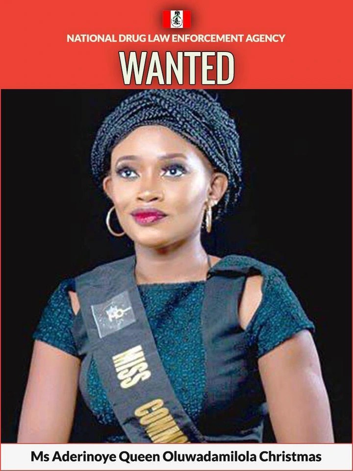 An ex-beauty queen, Ms Aderinoye Queen Christmas, also known as Ms Queen Oluwadamilola Aderinoye, has been declared wanted by the National Drug Law Enforcement Agency, NDLEA.