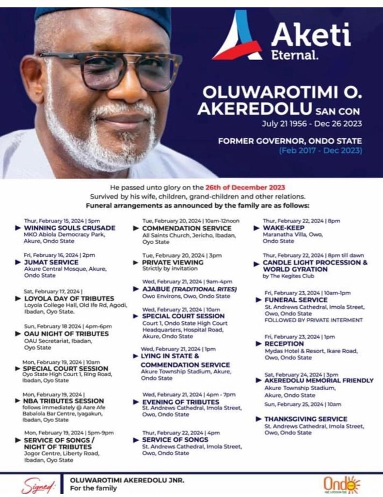 The burial activities for the late Governor of Ondo State, Arakunrin Oluwarotimi Akeredolu,SAN, CON, begin today with a winning soul crusade at the democracy Park Akure, the State capital.