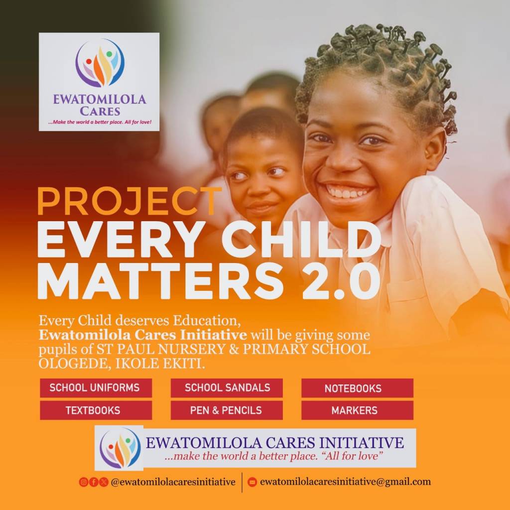 The Ewatomilola Cares Initiative, a non-profit organization set to host project “Every Child Matters 2.0” to donate school supplies to pupils of St Paul Nursery & Primary School, Ologede, Ikole Ekiti. The initiative aims to provide students with essential school materials such as school uniforms, sandals, notebooks, textbooks, pens, pencils, and markers.