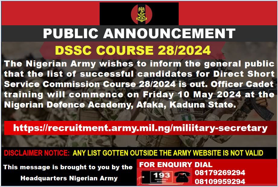 The Nigerian Army wishes to inform the general public that the list of successful candidates for DSSC Course 28/2024 is out and can be accessed on recruitment.army.mil.ng/military-secre.