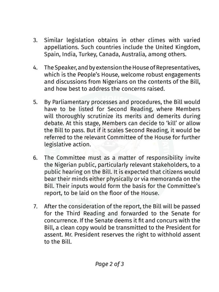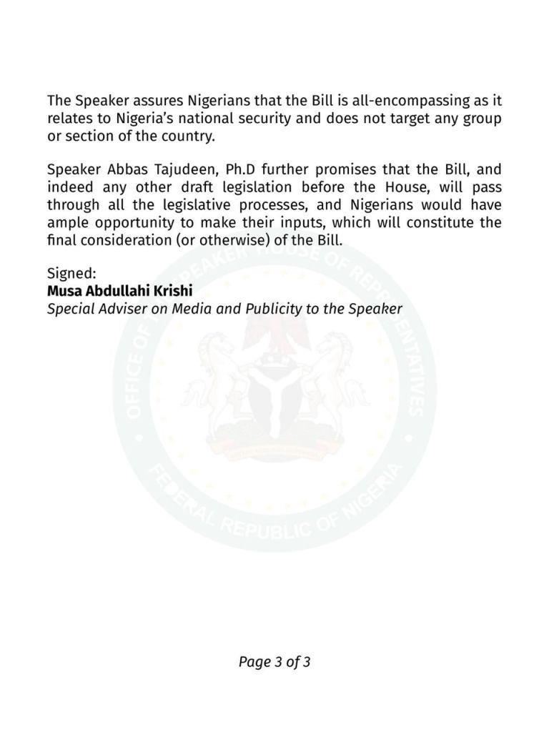 In response to the voices and concerns of the people, the Speaker of the House of Representatives, Rt. Hon. Abbas Tajudeen, Ph.D., has decided to withdraw the Counter Subversion Bill and other related draft legislation.