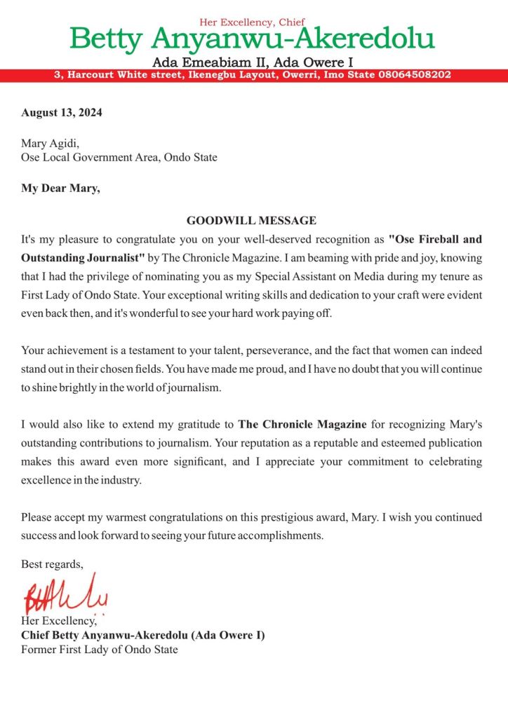 First Lady of Ondo State. Your exceptional writing skills and dedication to your craft were evident even back then, and it’s wonderful to see your hard work paying off.