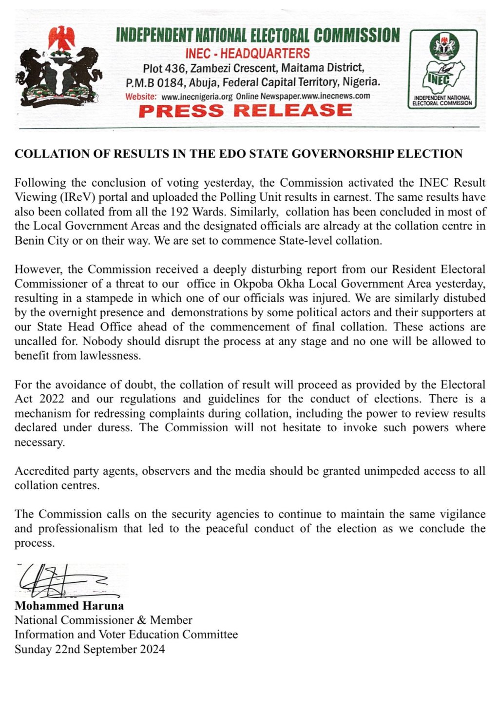 However, the Commission received a deeply disturbing report from our Resident Electoral Commissioner of a threat to our office in Okpoba Okha Local Government Area yesterday, resulting in a stampede in which one of our officials was injured. We are similarly distubed by the overnight presence and demonstrations by some political actors and their supporters at our State Head Office ahead of the commencement of final collation. These actions are uncalled for. Nobody should disrupt the process at any stage and no one will be allowed to benefit from lawlessness.