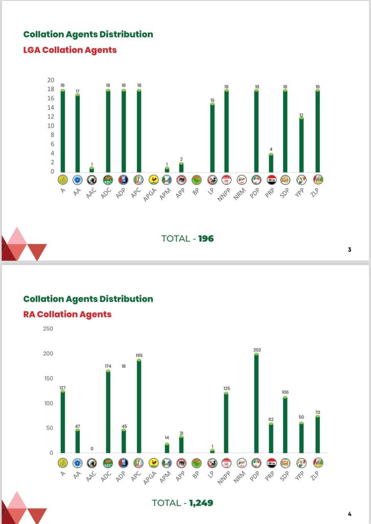 A political party fielding candidates in the election is expected to nominate 4,155 agents. From the 18 parties participating in the election, the Commission expected a cumulative figure of 74,790 agents. However, only 24,148 were uploaded to the portal, made up of 22,689 polling, 1,249 ward, 196 Local Government and 14 State collation agents. Put together, the 18 political parties nominated 32.3% of the expected number of agents.