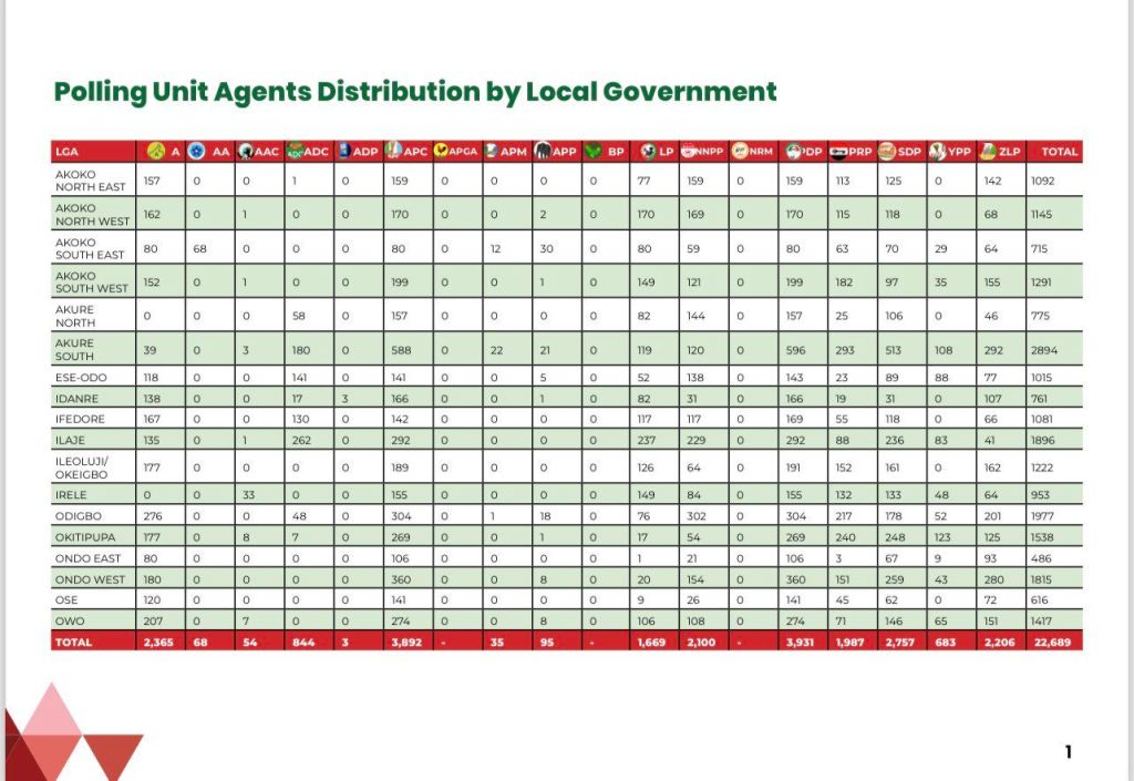 SUMMARY OF POLLING AND COLLATION AGENTS SUBMITTED BY POLITICAL PARTIES FOR THE 2024 ONDO STATE GOVERNORSHIP ELECTION