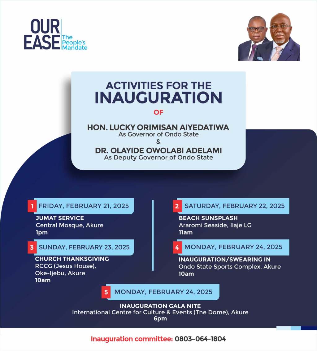 The Inauguration Steering Committee has, therefore, released the schedule of activities to mark the ceremony, starting on Friday, February 21, 2025 with a Jumat Service at the Akure Central Mosque by 1pm.