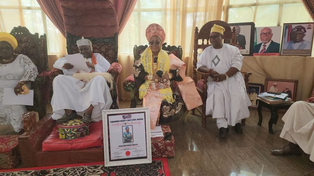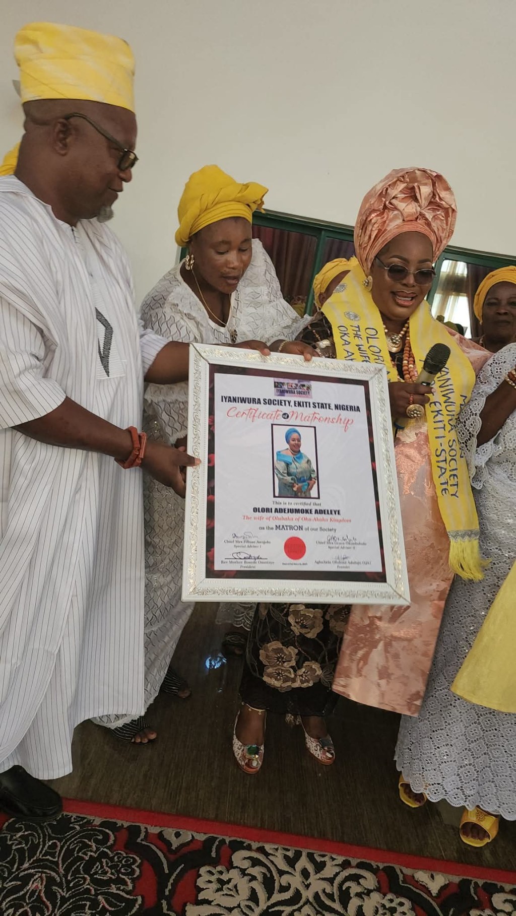 Olori Adejumoke Adeleye, wife of the Olubaka of Oka Akoko in Akoko South West Local Government Area of Ondo State, has been decorated as the Matron of Iyaniwura Society, Ekiti State.