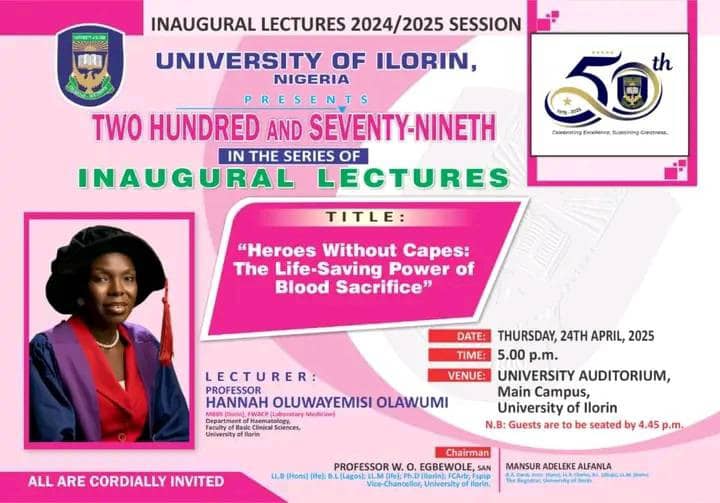 “Together, we can build a world where no one has to die because they cannot get the blood they need to survive.” These were the powerful closing words of Professor Hannah Olayemisi Olawumi, who delivered the 279th Inaugural Lecture of the University of Ilorin on Thursday, April 24, 2022, at the university auditorium.