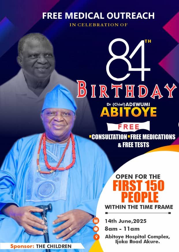 In marking the 84th birthday anniversary of the former Minister of State for Education, Dr. Adewunmi Abitoye, no fewer than 150 people benefited from free medical services at his hospital in Ijoka, Akure, on Saturday, 14th June 2024.
