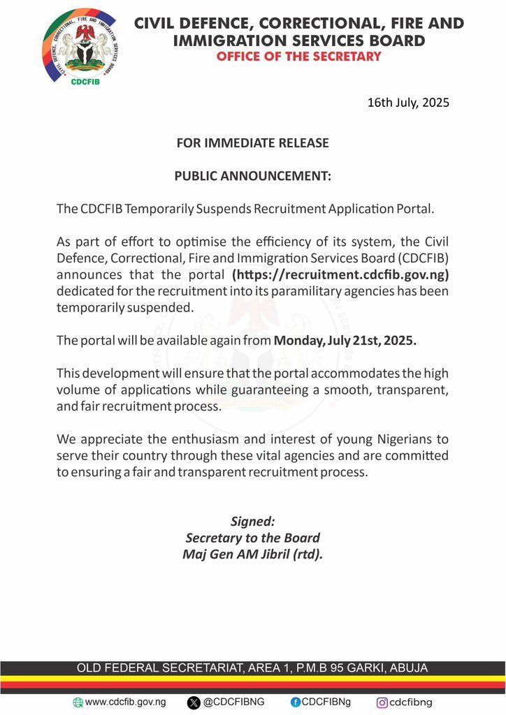 Ccivil Defence, Correctional, Fire and Immigration Services Board CDCFIB has announced a temporary suspension of its ongoing recruitment application portal.