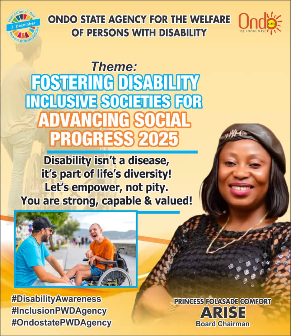 The Board Chairman of the Ondo State Agency for the Welfare of Persons with Disability, Princess Folasade Arise, has called for a collective commitment to building a more inclusive society where Persons with Disabilities (PWDs) can thrive without discrimination.